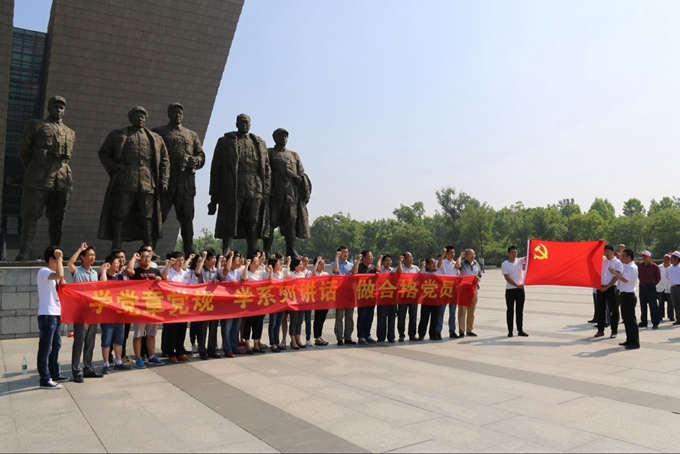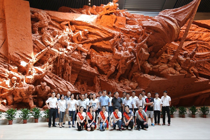 在渡江戰(zhàn)役紀念館雕像前,在交航公司機關支部委員帶領下,大家面對鮮紅的黨旗舉起右拳,莊嚴宣誓。
